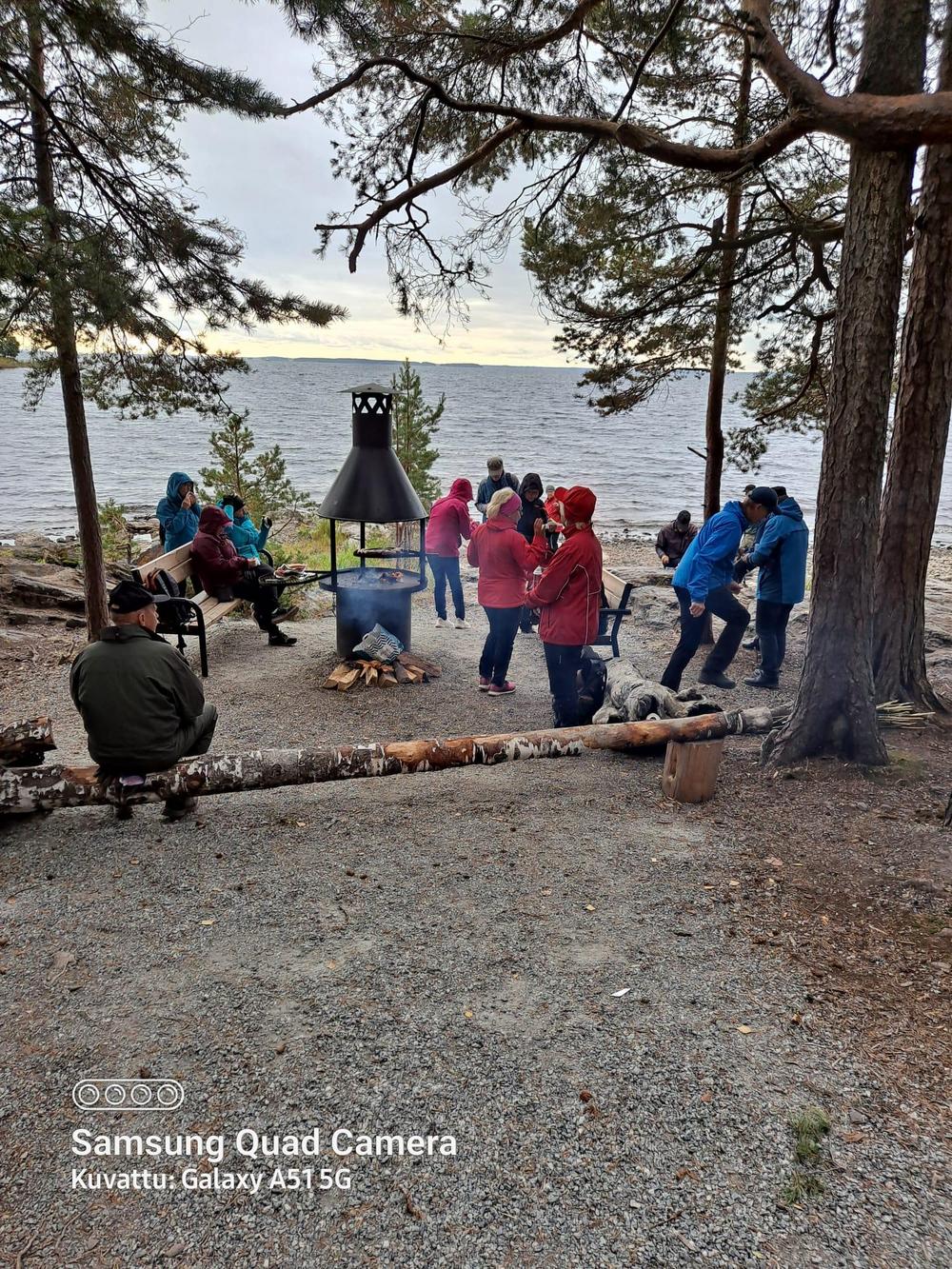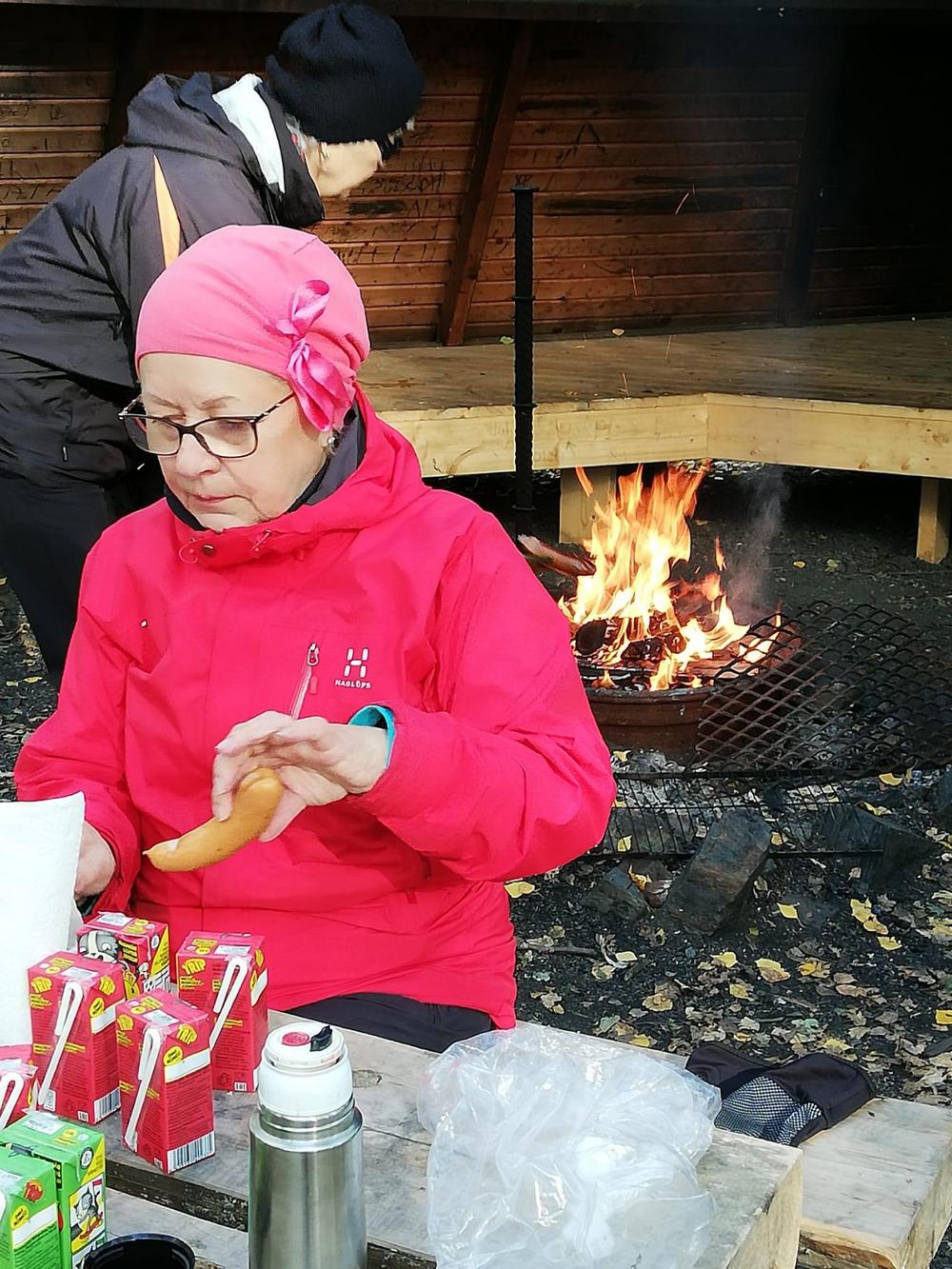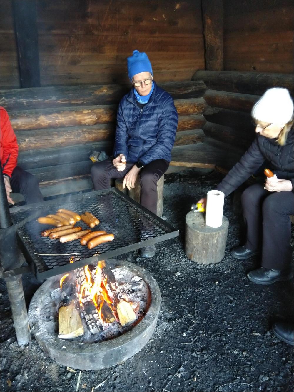 Vaellustetkellä Kuhasalossa. Meitä oli lähes 30. Aurinko paistoi, makkarat ja piirakat maistuivat.